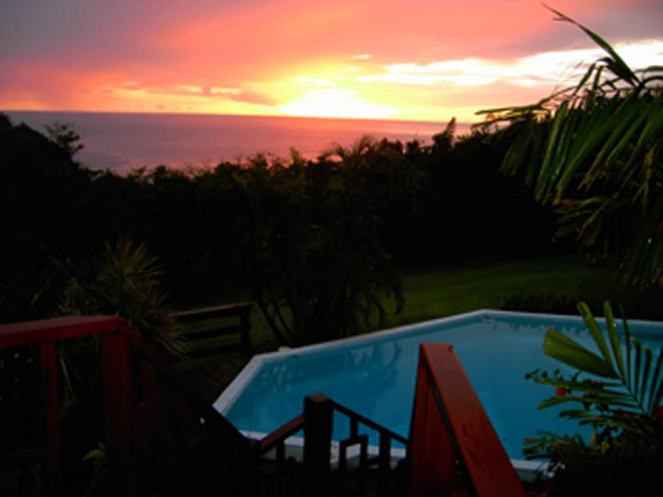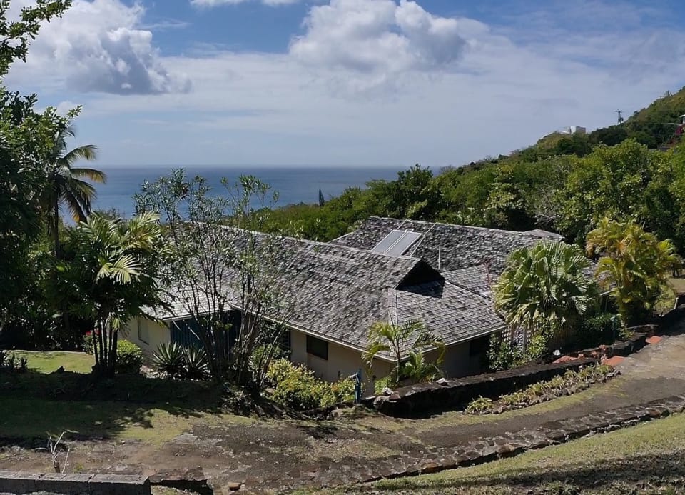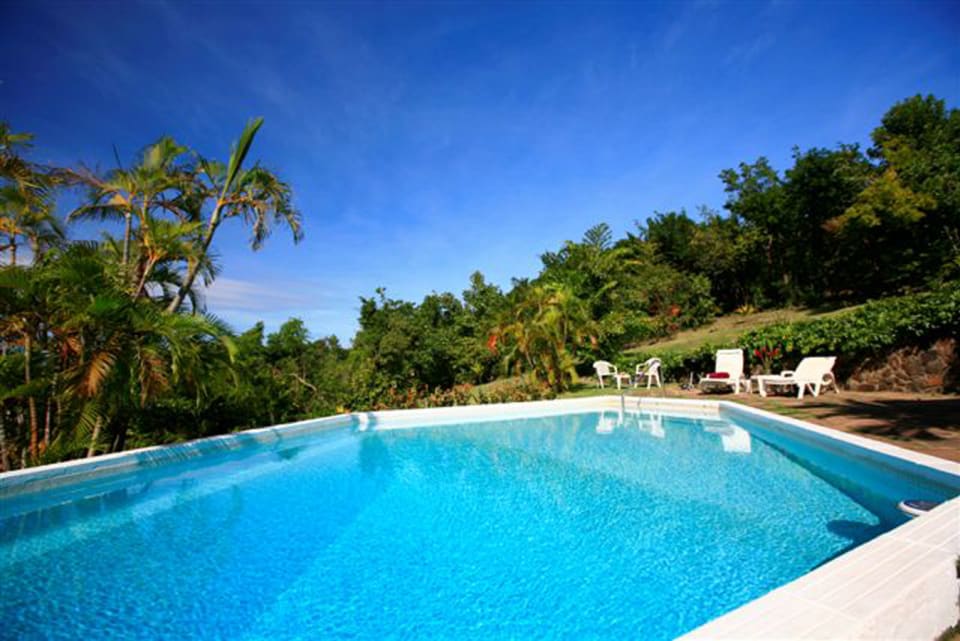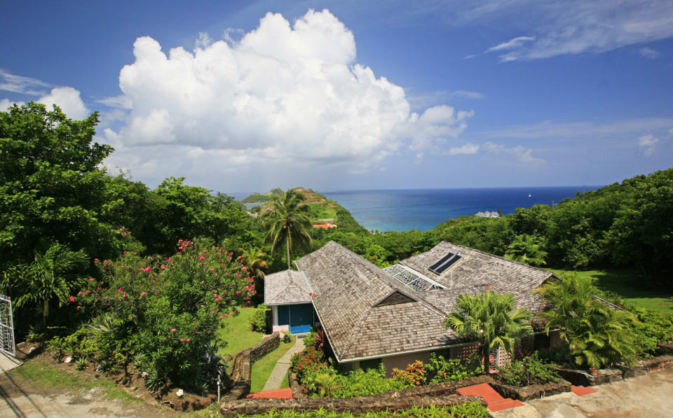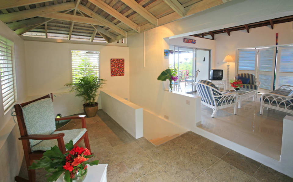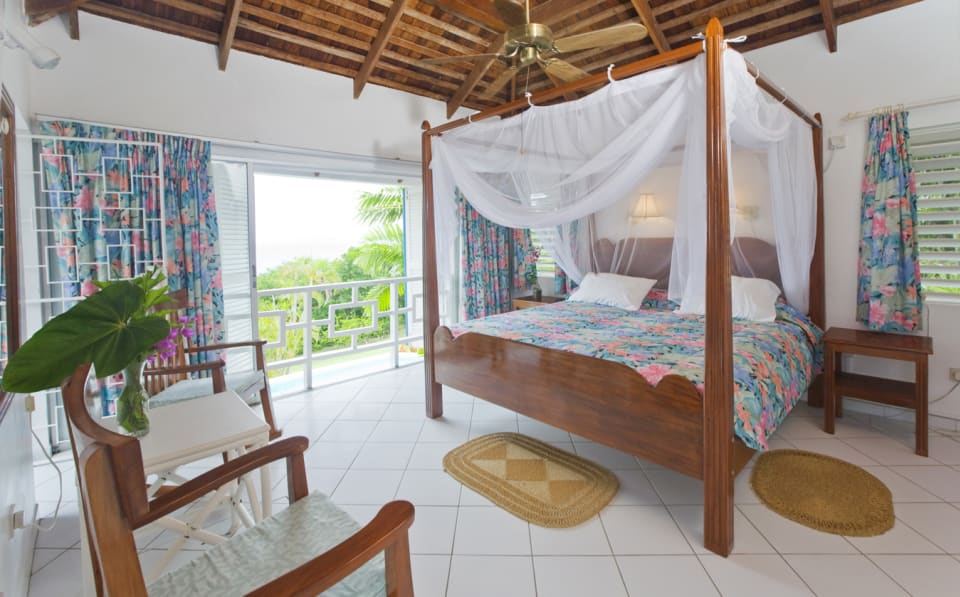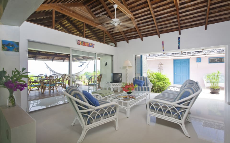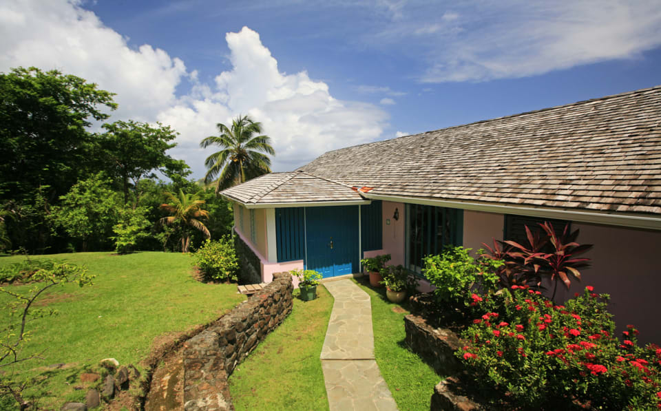 Featuring 3 air conditioned bedrooms – one with views of the Caribbean Sea – all with tropical decor, ceiling fans, mosquito nets and en-suite bathrooms. A courtyard with lush tropical foliage connects the living quarters with the bedrooms. A spacious, shingle roofed open-air dining patio is ideal for enjoying meals and cocktails at sunset; and an attractive, large pool is surrounded by a sun terrace. The pool terrace gives direct access to the surrounding lush gardens.