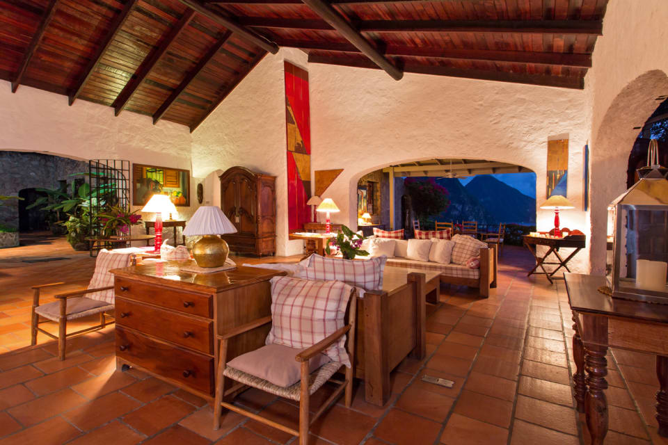 Tamarind House was built in 1979, Tamarind House sits on over an acre of land that is nestled above the hillside along the road to Anse Chastenet, above the town of Soufriere. Covering 8,850 SF of space, it is constructed of local stone with high greenheart ceilings and Barbados tile floors throughout. A circular courtyard filled with banana plants and flowers pulls you in and brings you straight to the arched doorway that leads to the expansive 2,550 SF living space. There is a terrace where the tamarind tree grows up out of the tiles and provides shade and coolness to the house all through the day. Throughout the house is uninterrupted views of the World Famous Pitons and the Caribbean Sea.