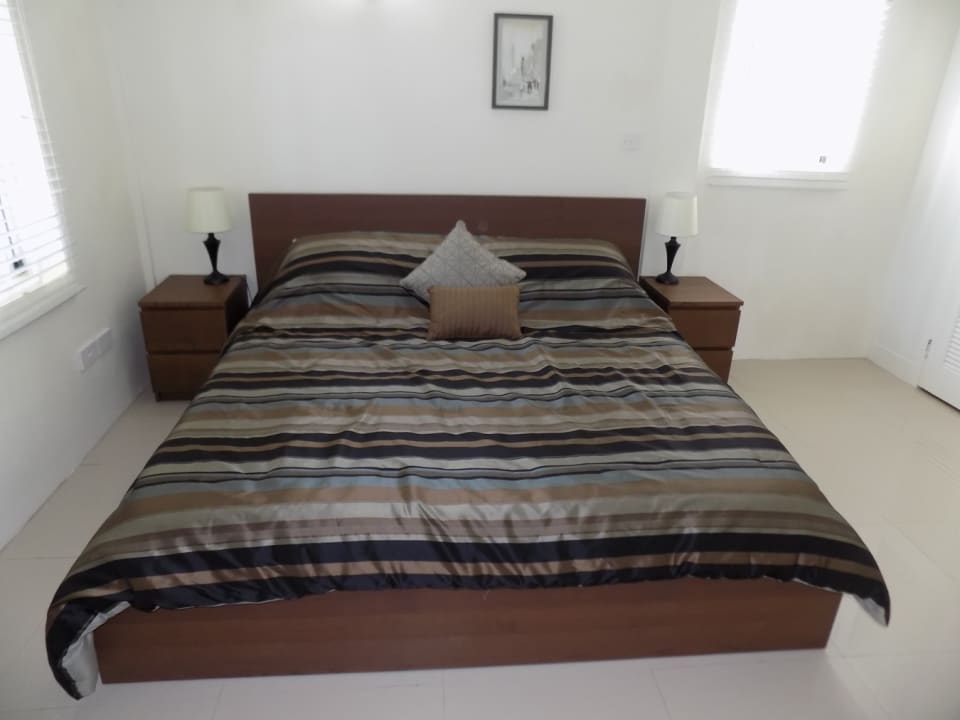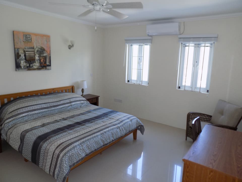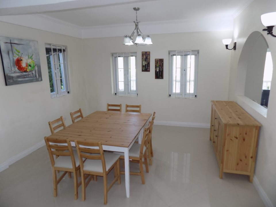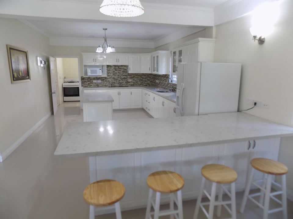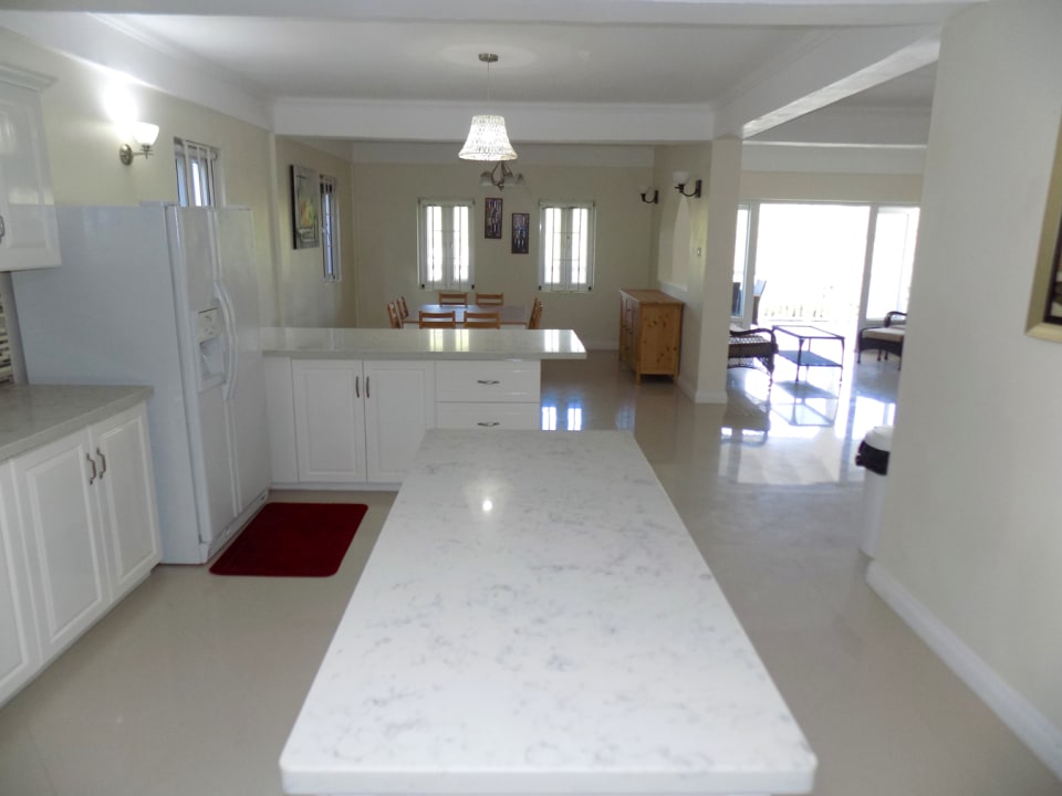 The open plan living space features a functional kitchen; equipped with a stone counter-top and island, modern appliances, and a separate utility room. The kitchen looks over the breakfast bar into a cozy dining room, and spacious living room, which accesses the patio through double PVC doors. The light coming in from the large doors and generously sized windows bounces off the high ceilings, resulting in a beautiful bright and airy space. Neutral colored ceramic tiles extend from the living area into the bedrooms and bathrooms, as well as the patios.